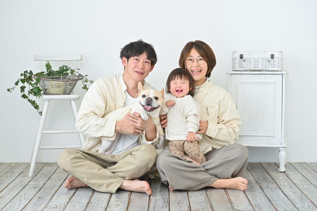シンプルな白背景で、ナチュラルな雰囲気の家族写真を撮影します。